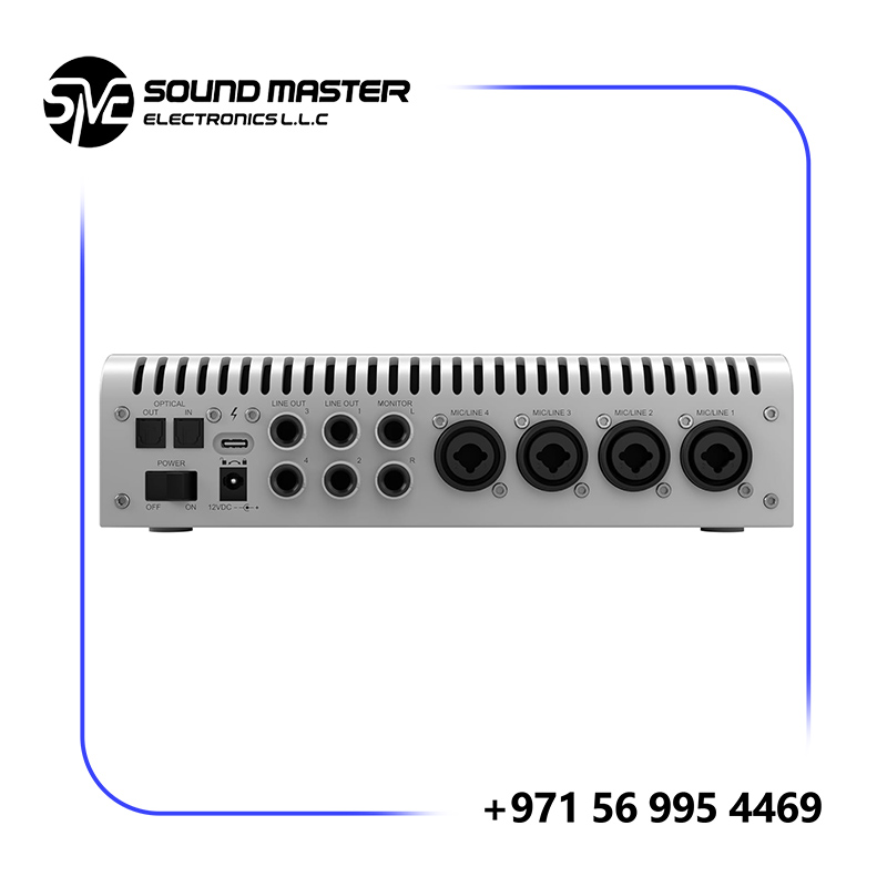 - Extensive I/O: 12 Inputs × 18 Outputs — 4× XLR/TRS mic‑line inputs, 2× front-panel Hi-Z instrument inputs, multiple line outs, monitor outs, dual headphone outputs, plus optical ADAT/SPDIF I/O for expansion.